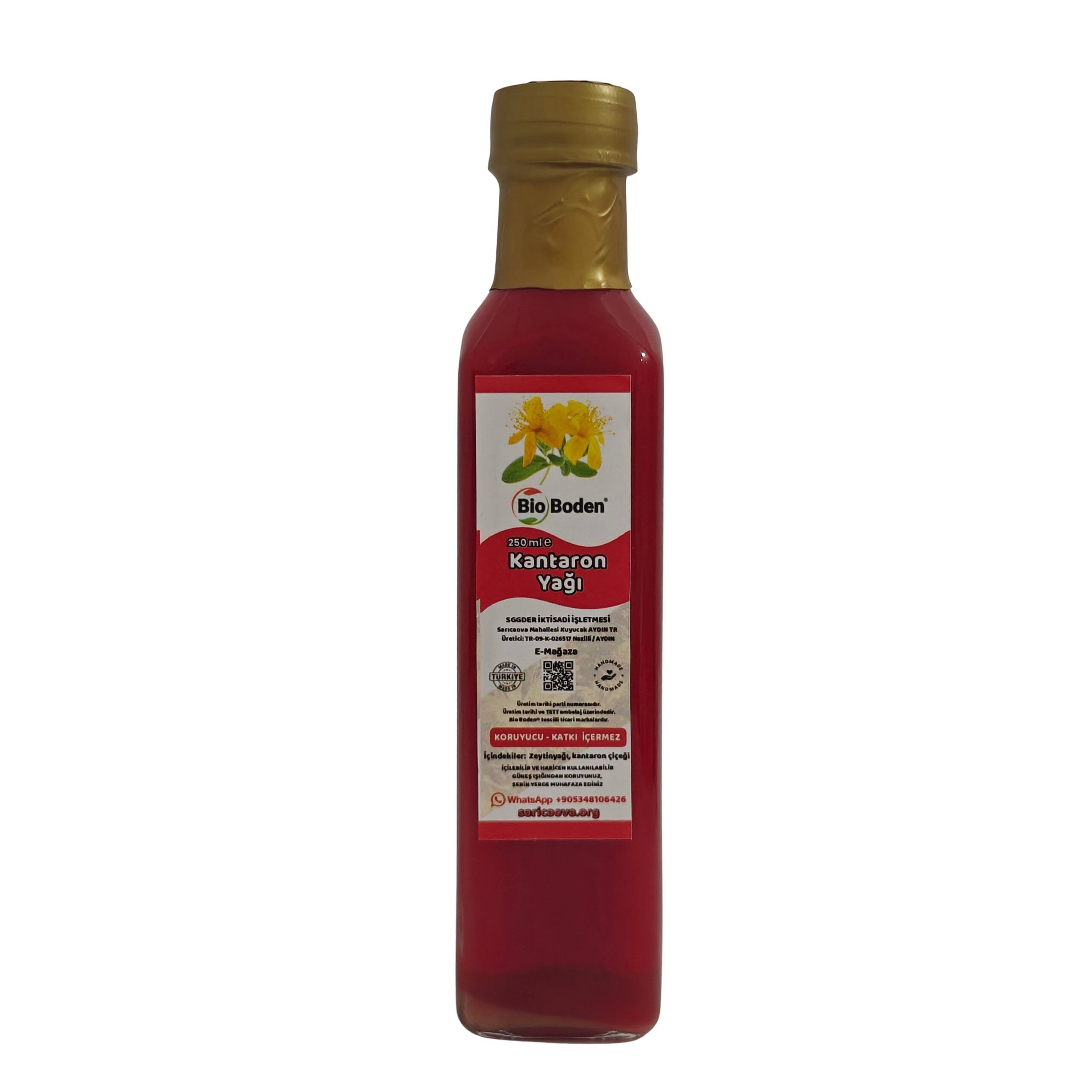 Kantaron yağı 250 ml. Cam ambalaj. Doğal yöntemlerle üretilmiştir.